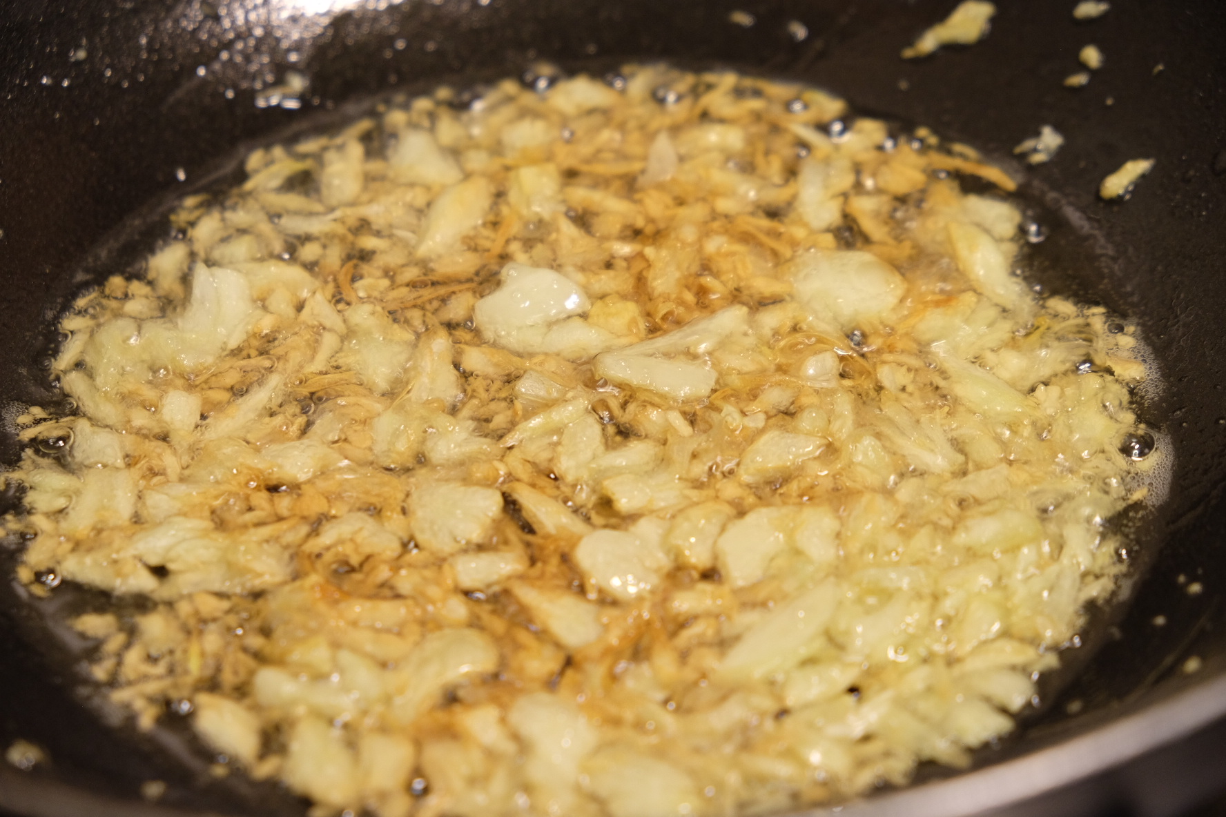 3. You can now start frying the minced garlic into the wok. Reminder: do not burn the garlic as it would taste bitter. Set aside half a portion of the fried garlic.